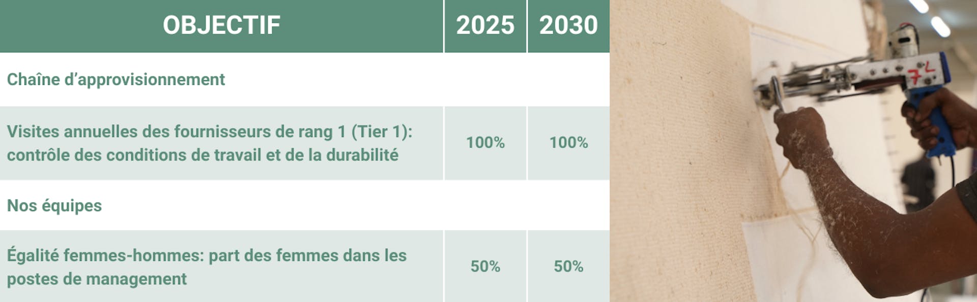 Pour nous, la durabilité est une question de personnes. Des fabricants de nos tapis à tous les membres de notre propre équipe. C’est pourquoi nous visitons en personne nos fournisseurs de rang 1 chaque année. Ainsi, nous voyons directement la façon de travailler et pouvons vérifier que cela se fait en toute sécurité, de façon équitable et dans le respect de toutes les personnes autour du produit.