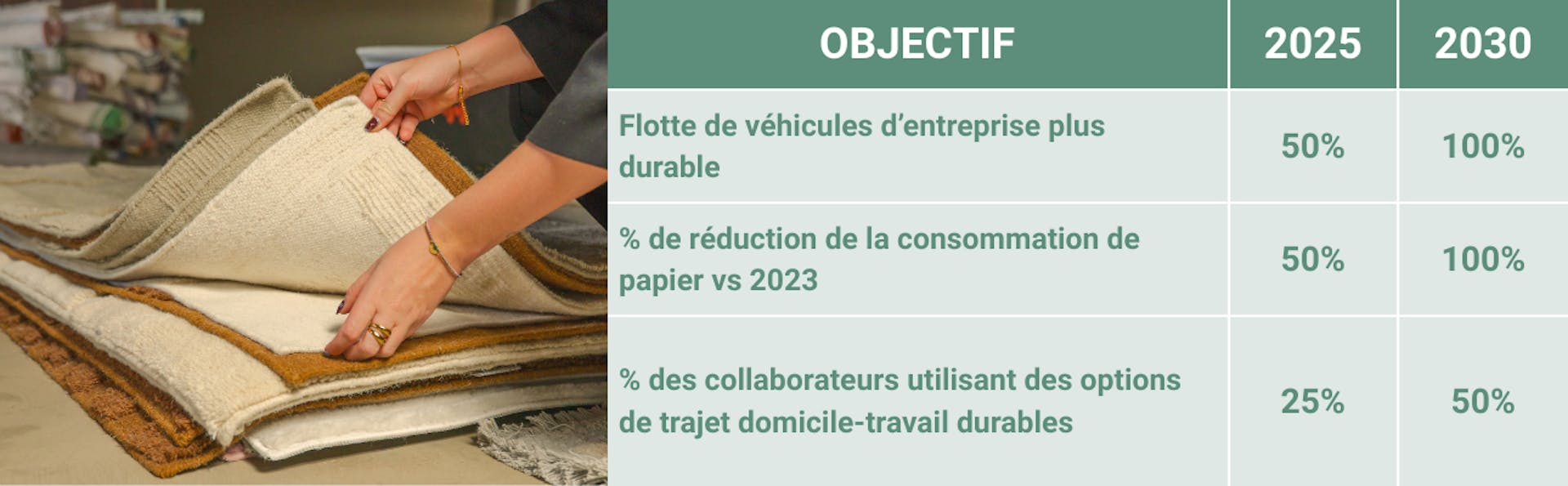 Depuis nos débuts en tant que spécialiste en ligne du tapis, nous avons poursuivi un objectif avant tout : rendre votre maison plus chaude et plus accueillante. Mais avant qu’un tapis n’arrive chez vous, il a déjà parcouru un long chemin. Des fils et ateliers de tissage jusqu’à l’entrepôt et à la livraison, tout ce processus a un impact. Et nous n’allons pas l’ignorer.